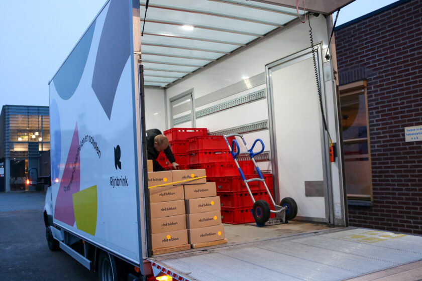 De vrachtwagen is compact, met voorin plek voor twee en achterin een ruime laadruimte met laadklep en zijdeur. In die laadruimte ligt een steekkarretje en staan kratten met boeken langs de zijkant opgestapeld. Tussen elk boek zit een wit briefje waarop staat waar het boek vandaan komt en waar het naartoe moet. De meeste boeken zijn bij Rijnbrink op de expeditie gesorteerd, maar Melvin sorteert ook boeken onderweg. ‘De bibliotheken weten welke route ik rijd en sorteren alvast de boeken die ik dezelfde dag nog kan afleveren. De rest gaat eerst terug naar Rijnbrink, zodat we ze daar voor de volgende dag kunnen sorteren’, vertelt hij.
