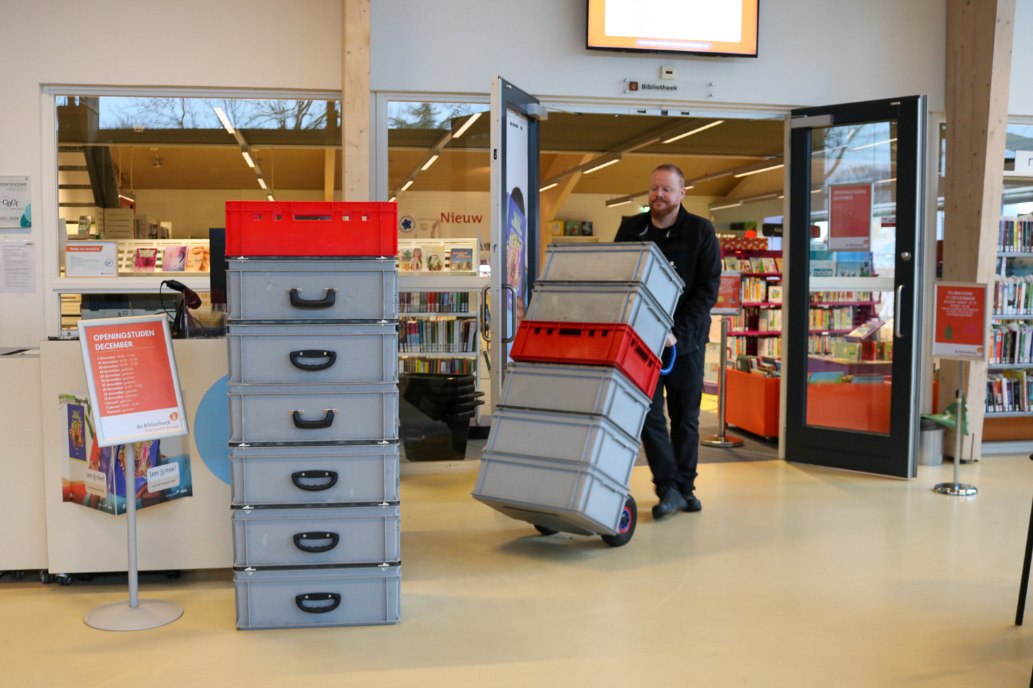 In Vaassen is alles nog donker. Terwijl ik vrolijk kletsend uit de vrachtwagen stap, wijst Melvin me erop dat ik zachtjes moet zijn. ‘De mensen in deze straat slapen misschien nog’, lacht hij. De bibliotheek is nog gesloten. Melvin heeft sleutels mee van bijna alle bibliotheken op zijn route. Zo is hij niet afhankelijk van of er iemand aanwezig is of niet. Hij rijdt het steekwagentje naar binnen en wisselt zonder moeite volle en lege kratten om. In nog geen vijf minuten staan we weer buiten. ‘Soms maak ik een praatje, soms ben ik in en uit. Het hangt van de plek af.’ Terug in de vrachtwagen sorteren we vast de boeken uit voor de rest van de rit.