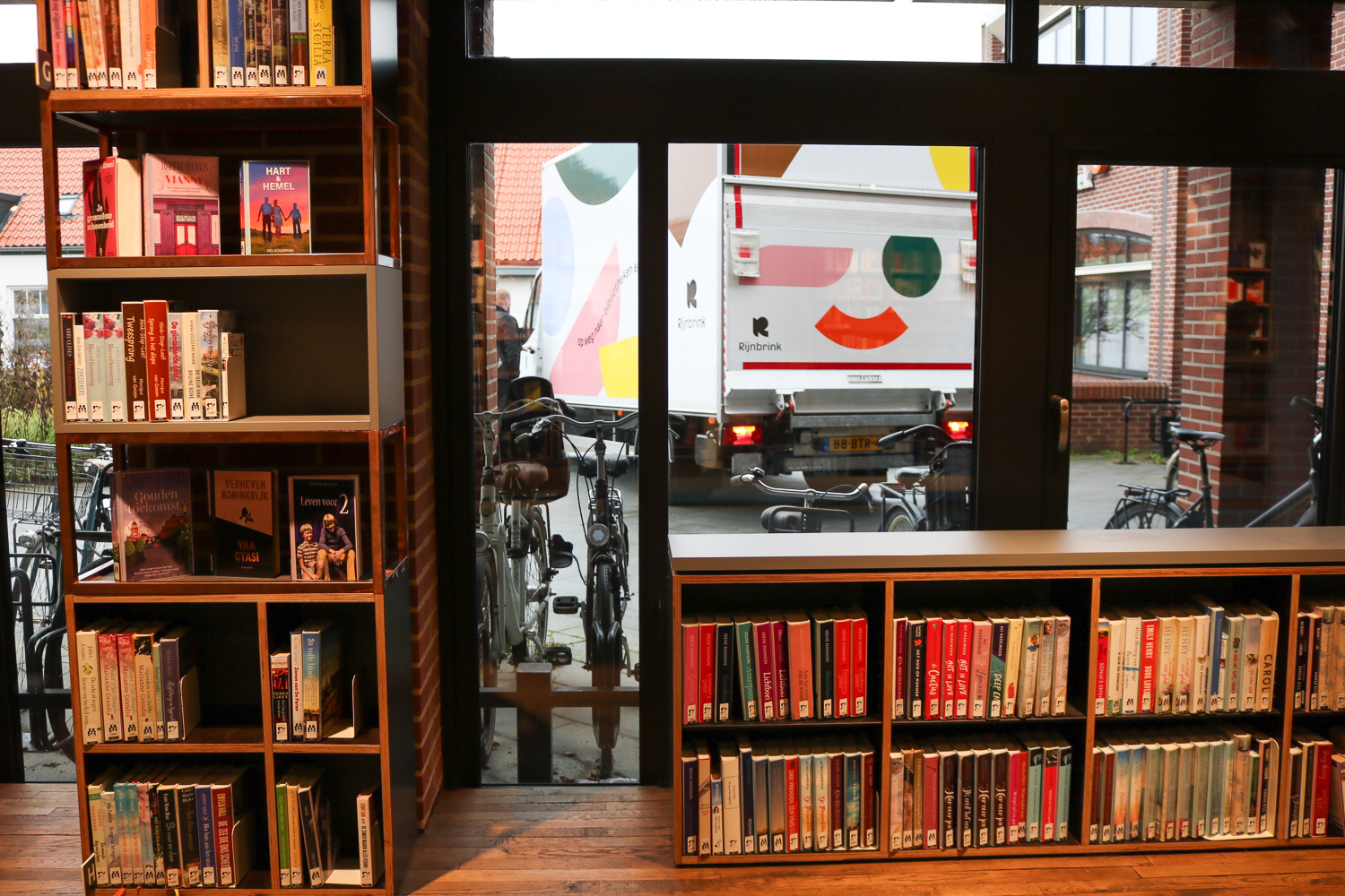 Melvin is gekleed in Rijnbrink-bedrijfskleding, met een logo op zijn rug en broek. Voordat we instappen biedt hij me koffie aan. Het is koud en vroeg, dus dat bakkie is wel welkom. Dan starten we de wagen en vertrekken we richting de eerste bibliotheek op onze route: Vaassen. Het valt me op dat Melvin geen navigatie start. ‘Ik heb die routes al zo vaak gereden, ik ken ze uit mijn hoofd.’