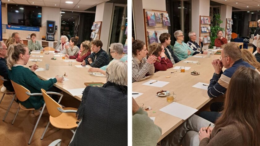 In Hoevelaken is de workshop volledig volgeboekt. Hoewel het buiten al donker is, brandt in de bibliotheek nog licht. Aan een grote lange tafel zitten mannen en vrouwen van alle leeftijden. Ze hebben allemaal een dampend kopje koffie of thee voor zich, en een spierwit vel en een pen: het gereedschap van vanavond. Wethouder Mariëlle Broekman opent de avond en dan is het tijd om de handen uit de mouwen te steken.