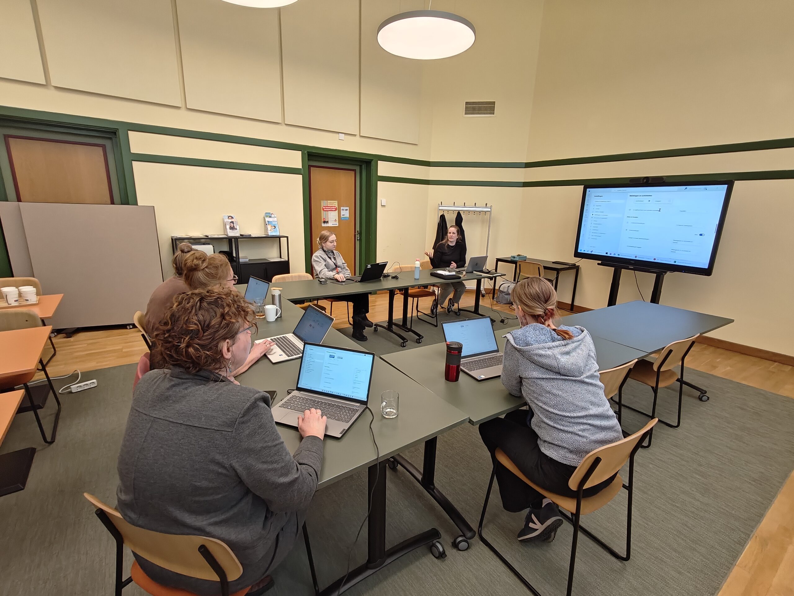 Een trainingsgroep bestaat meestal uit acht tot tien deelnemers. In de training gaan zij direct praktisch aan de slag in hun eigen Teams-omgeving. ‘Het voordeel daarvan ten opzichte van een testomgeving is dat we de instellingen ter plekke goed kunnen zetten’, legt Corine uit. ‘Ik doe dingen voor op een groot scherm en de bibliotheekmedewerkers werken in hun eigen omgeving. Mijn collega kijkt mee op hun beeldschermen en kan helpen als het nodig is. Dat werkt heel fijn.’